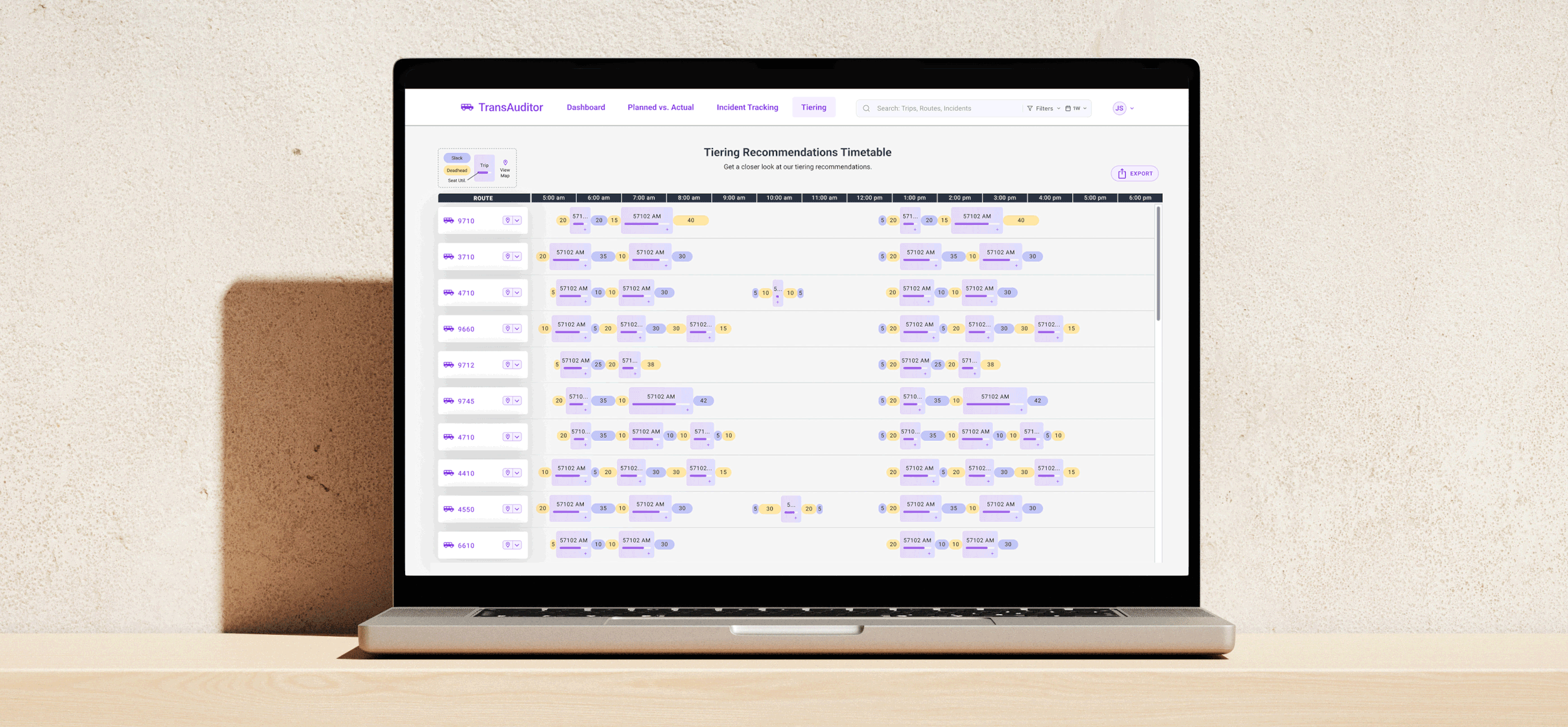 Tiering refers to organizing bus routes and schedules into different time “tiers” so that the same buses can be used for multiple runs in a single morning or afternoon. This tool—built for Routing Analysts—uses our team’s carefully configured algorithms to evaluate the efficacy of a district’s current tiering system. I designed an approach that displays routes (the planned path a bus follows to pick up or drop off students in the AM or PM; comprising 2–4 trips), trips (a single instance of operating within a route for one school at one time), and slack time (the downtime between trips) in an easy-to-digest way. Users can filter to choose which routes they want to evaluate and add them to a “cart” to be reconfigured later.