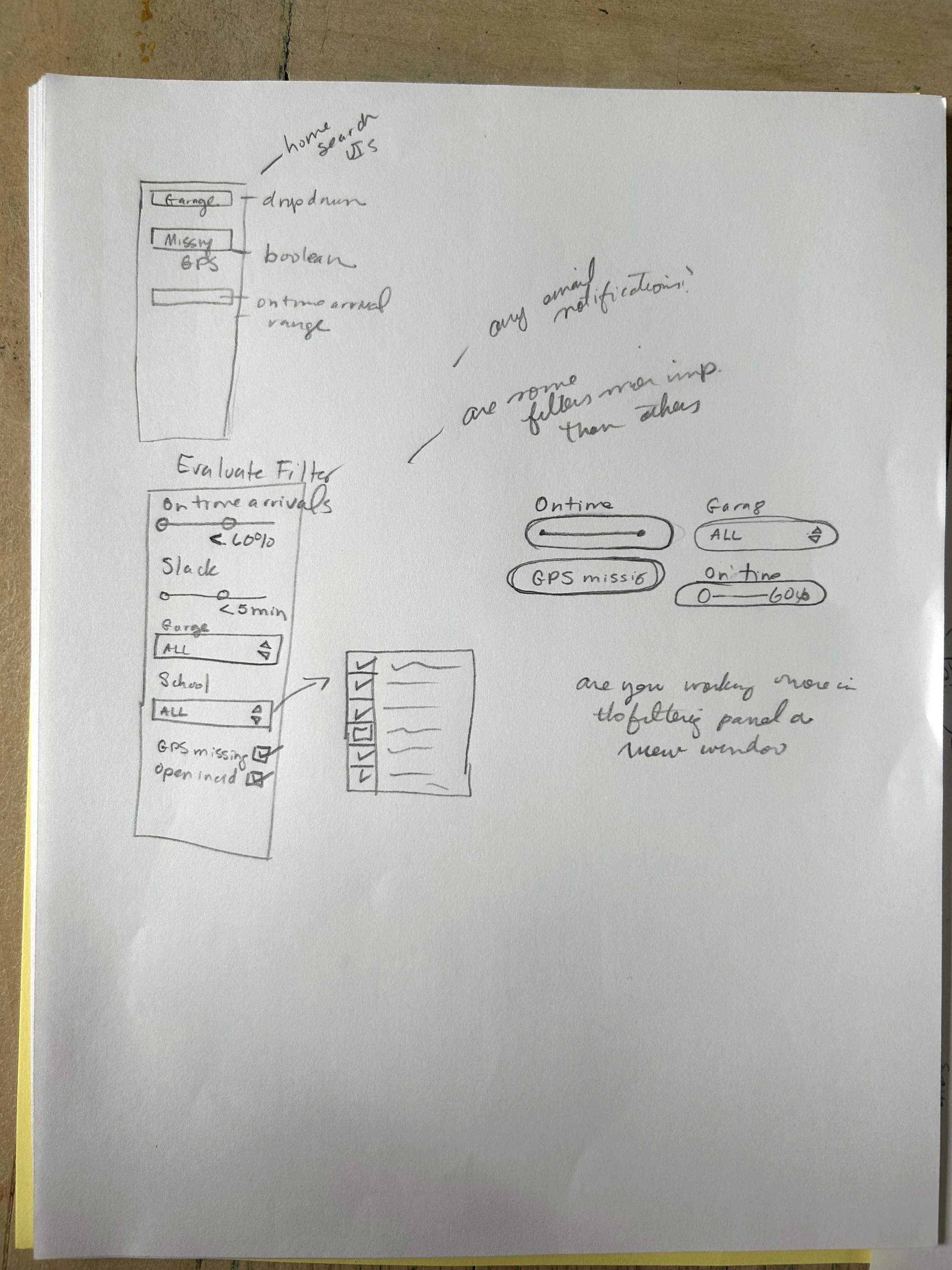 Flows: With the tabulated survey data, persona needs, and the Product Manager’s general direction I sketched a user journey flow for the TransAuditor product that includes 5 separate, yet integrated modules: Dashboard, Planned Vs. Actual KPIs, Route Tiering Analysis, Route Re-Tiering Process, and Incident Tracker. The 3 modules that I have focused on answering “How might we?” are the Dashboard, Tiering Analysis and Tiering Process. I began my ideation process with hand sketches to see what approaches might best solve for the issues at hand.