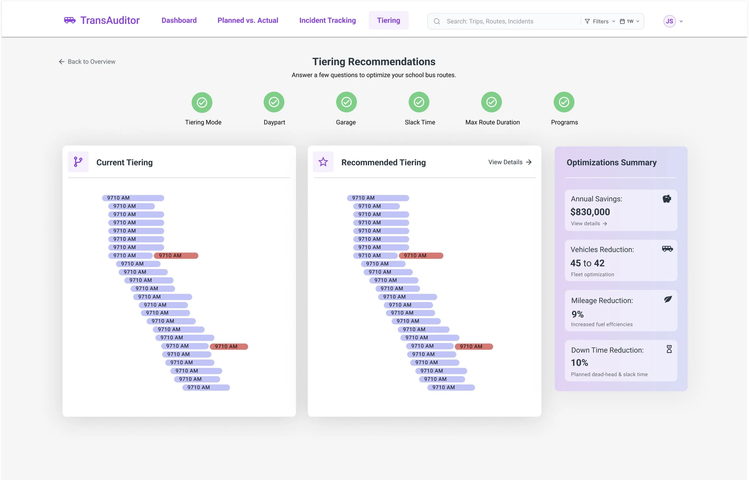 Continuing the Routing Analyst’s workflow, this tool takes routes that have been evaluated and marked inefficient, deeming them candidates for “re-tiering” (breaking up trips from existing routes and reorganizing them to reduce late arrivals, vehicles on the road, travel time for students, and overall costs). This module reduces six weeks of manual work to three or four days. I built a step-by-step process for users who want to re-tier existing routes. After completing the flow, users receive a high-level summary of potential economic and environmental optimizations. For more granular detail, they can view a detailed timetable with the newly suggested routes. This shows route information including SPED requirements as well as seat utilization (students ÷ vehicle capacity). Downtime is differentiated from driving time by shape and color. Users can open a dialog box with a GPS map of the route. After feedback from several potential clients, we heard a consistent request: "Please display a summary of cost savings.” So we updated the flow to include a financial savings view and itemized cost breakdown.